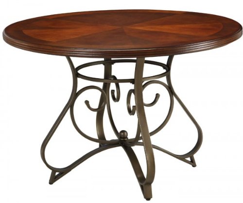 The Hamilton Dining Table features an interesting curve and scroll designed bottom. This piece is sure to add interest and ample table space to any home decor. The perfect piece for your family to gather around. 'Brushed Faux Medium Cherry' wood top 'Matte Pewter and Bronze' metal Some assembly required