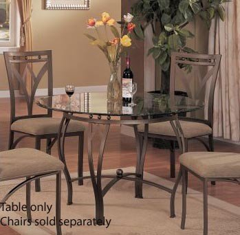 For distinctive styling select our round glass top dining table with metal accents. Double split curve legs and center cross flat bars display a casual elegance for the round 8mm beveled clear glass top perfect in any dining d**cor. The chairs are sold separately.